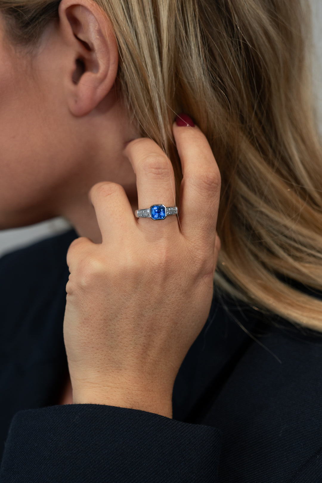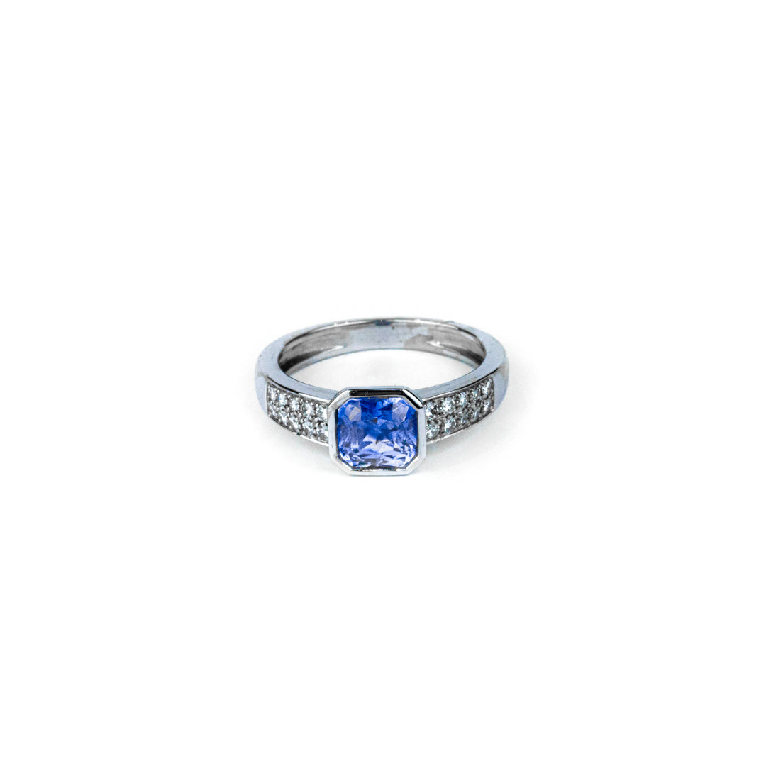 Bague de la collection Cinq C, création unique, or blanc 18 carats 750/1000, sertie d'un Saphir Ceylan couleur Cornflower de 1,73 carats et de 20 Diamants pour 0,26 carats.
