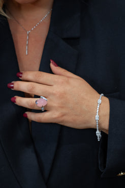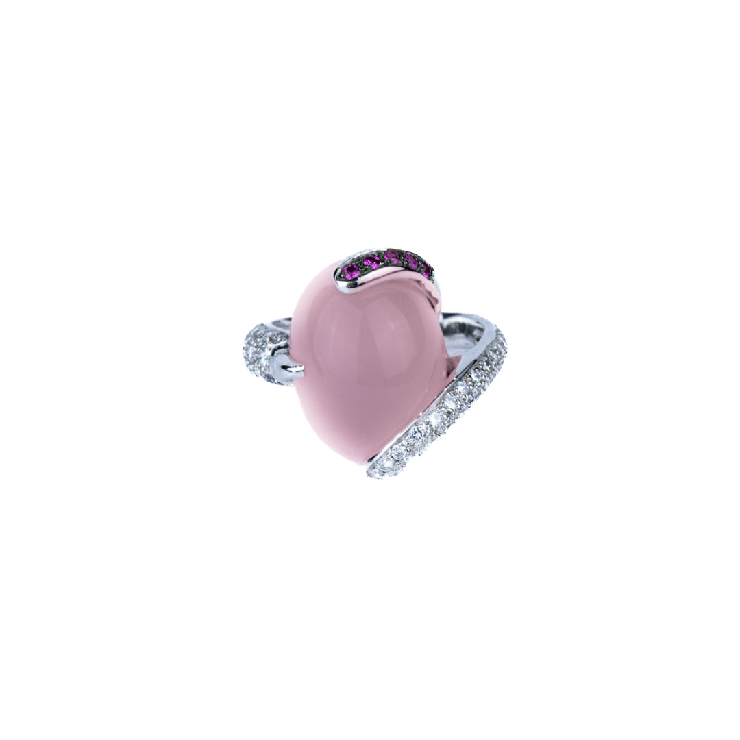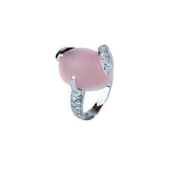 Bague de la collection Cinq C, création unique, or blanc 18 carats 750/1000, sertie d'un Quartz Rose Cabochon, de 41 Diamants pour 0,23 carats et de 5 Saphirs Roses pour 0,11 carats.
