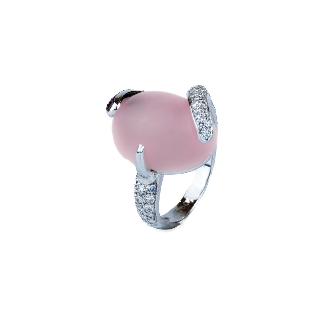 Bague de la collection Cinq C, création unique, or blanc 18 carats 750/1000, sertie d'un Quartz Rose Cabochon, de 41 ...
