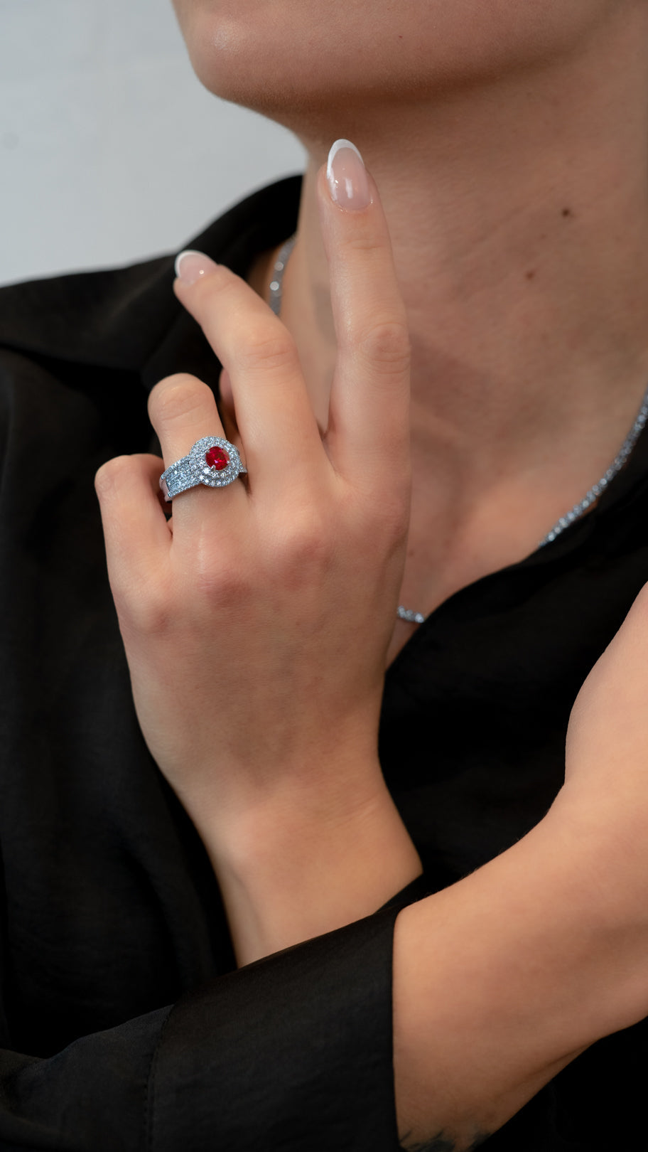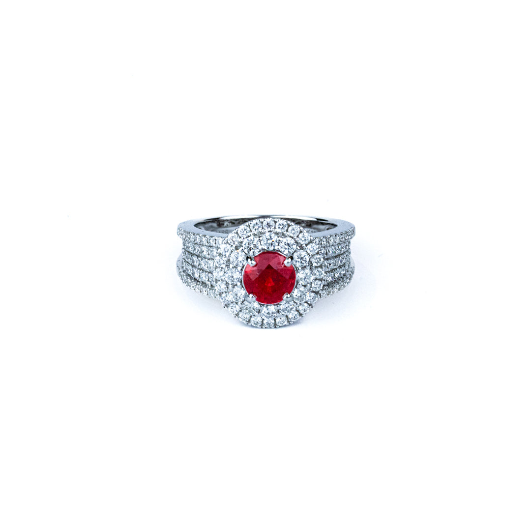 Bague de la collection Cinq C, création unique, or blanc 18 carats 750/1000, sertie d'un Rubis Birman extrait des Mines de Mogok de taille ronde de 1,18 carats ainsi que de 108 Diamants pour 1,88 carats.