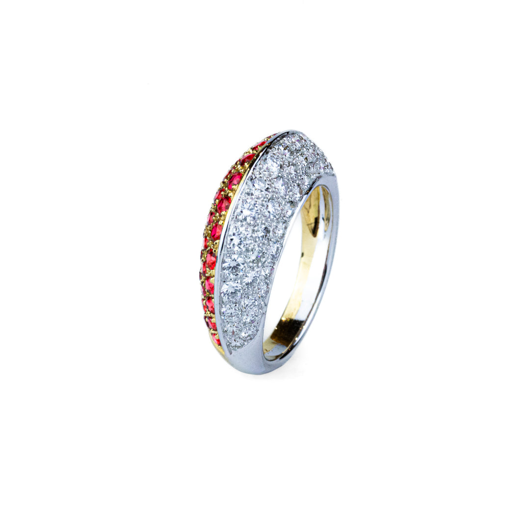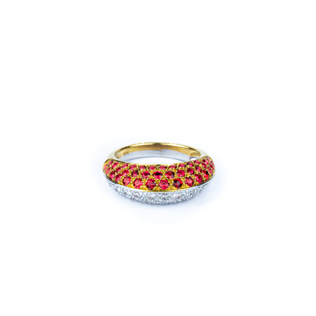 Bague de la collection Cinq C, création unique, deux ors 18 carats 750/1000 (or jaune et or blanc), sertie de 38 Rubis pour 1,2 carats et de 38 Diamants pour 1 carat.