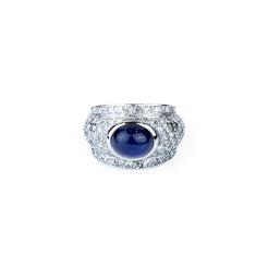 Bague de la Collection Vintage, or blanc 18 carats 750/1000, ornée en son centre d'un Saphir Cabochon de couleur bleu. Les Côtés sont parsemés d'un pavage de 78 Diamants et d'une trace de poinçon tête d'aigle.