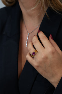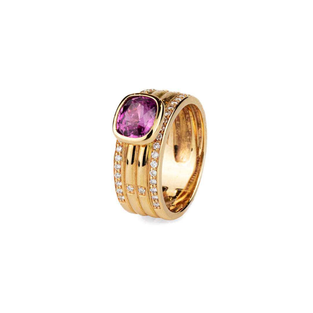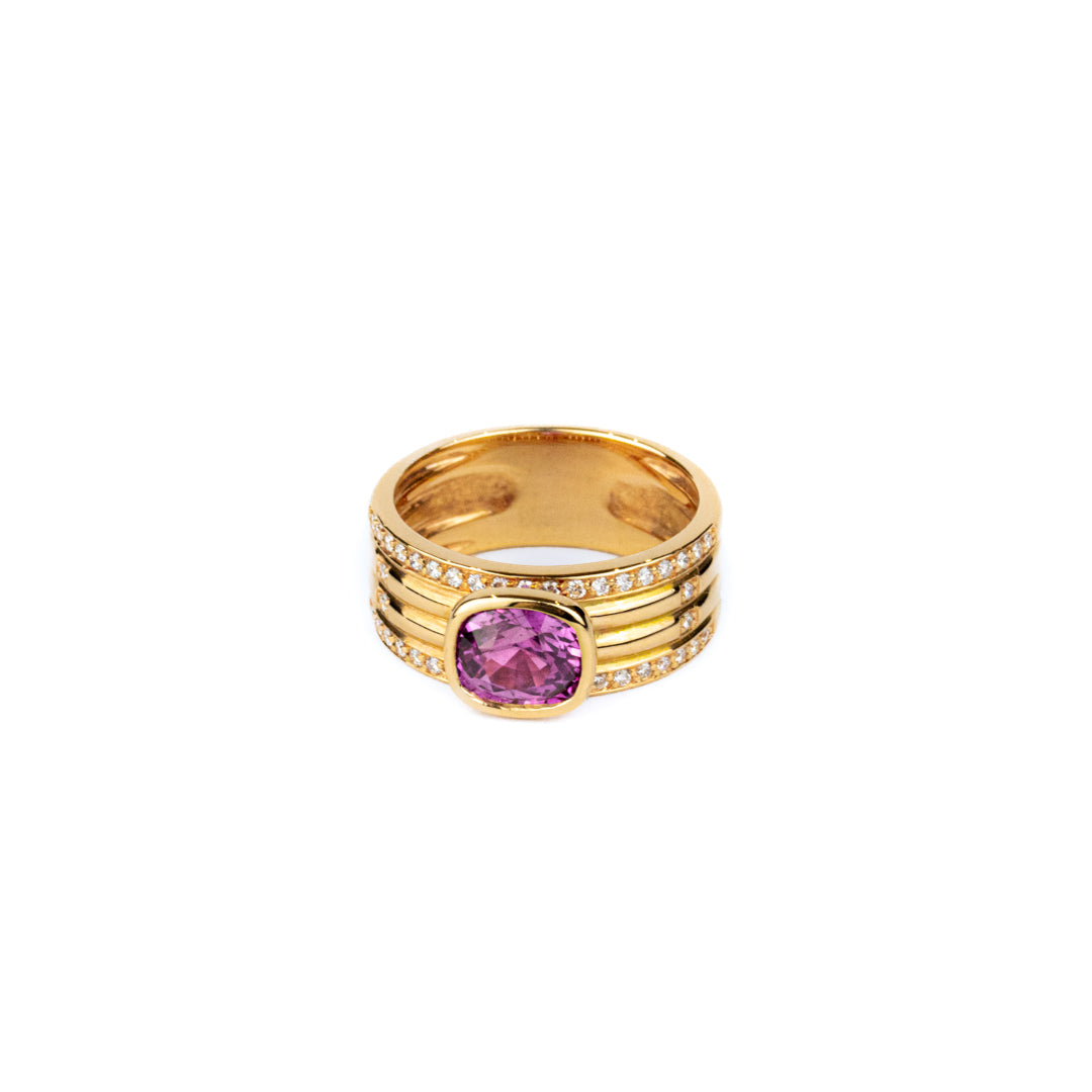 Bague de la collection Cinq C, création unique, or jaune 18 carats 750/1000, sertie d'un Saphir Rose provenant de Madagascar de 1,73 carats et de 43 Diamants pour 0,24 carats.