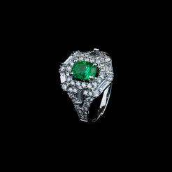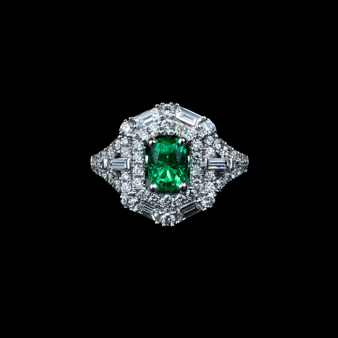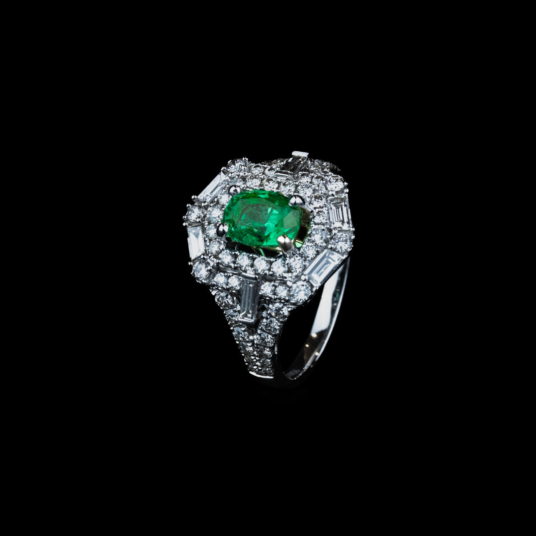 Bague de la collection CinqC, création unique, or blanc 18 carats 750/1000, sertie d'une Émeraude de 1,40 carats, accompagnée de 56 Diamants pour 0,736 carats et de 6 Diamants taille baguettes pour 0,32 carats.
