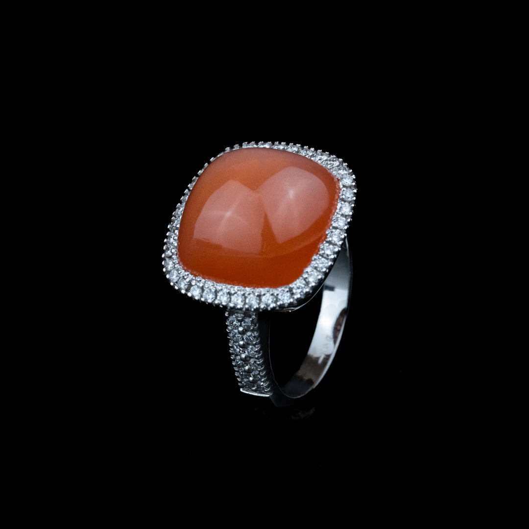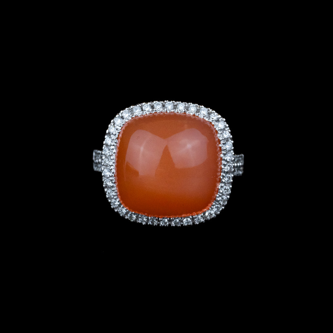 Bague de la collection Cinq C, création unique, or blanc 18 carats 750/1000. Au centre une Pierre de Lune Orange taille Cabochon carré de 13,50mm par 13,70mm.