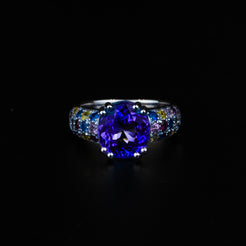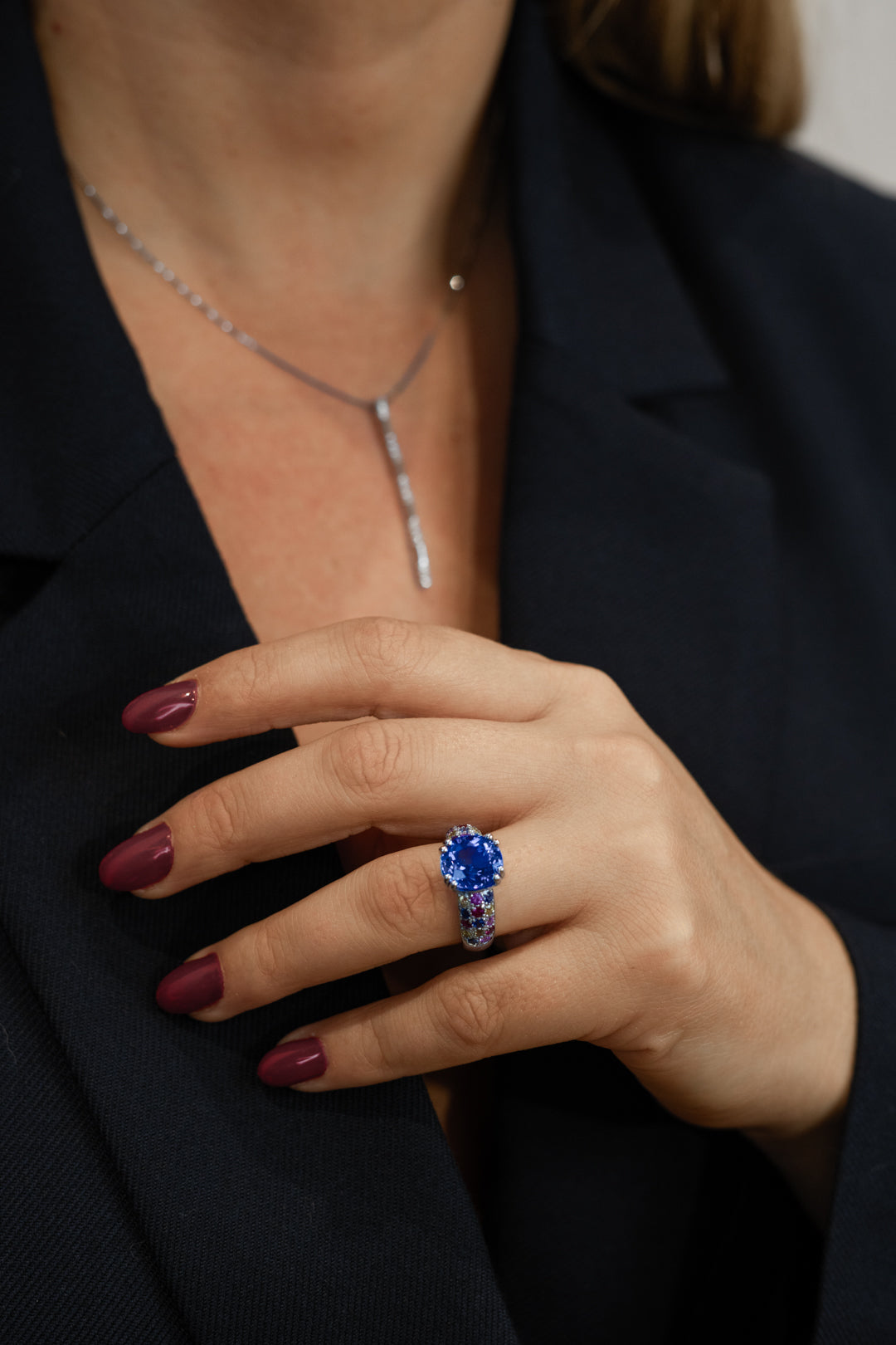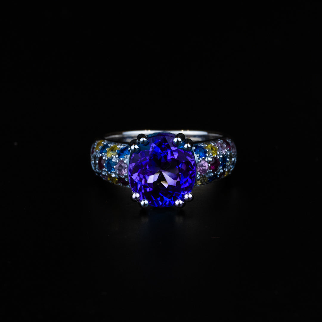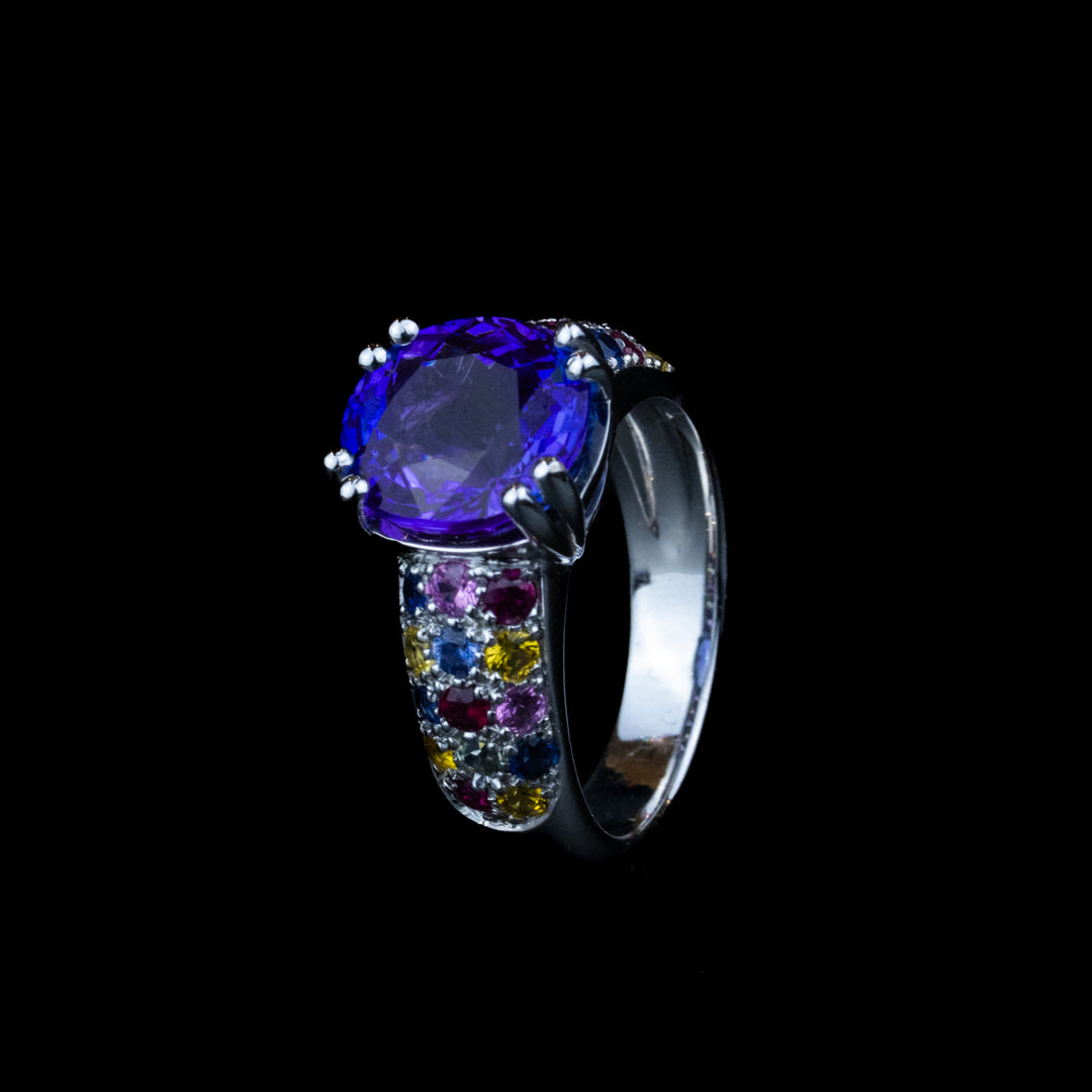 Bague de la collection Cinq C, création unique, or blanc 18 carats 750/1000, serti en son centre d'une Tanzanite de 4,23 carats, accompagnée de 25 Saphirs Fancy (multicolore) de 1,15 carats.