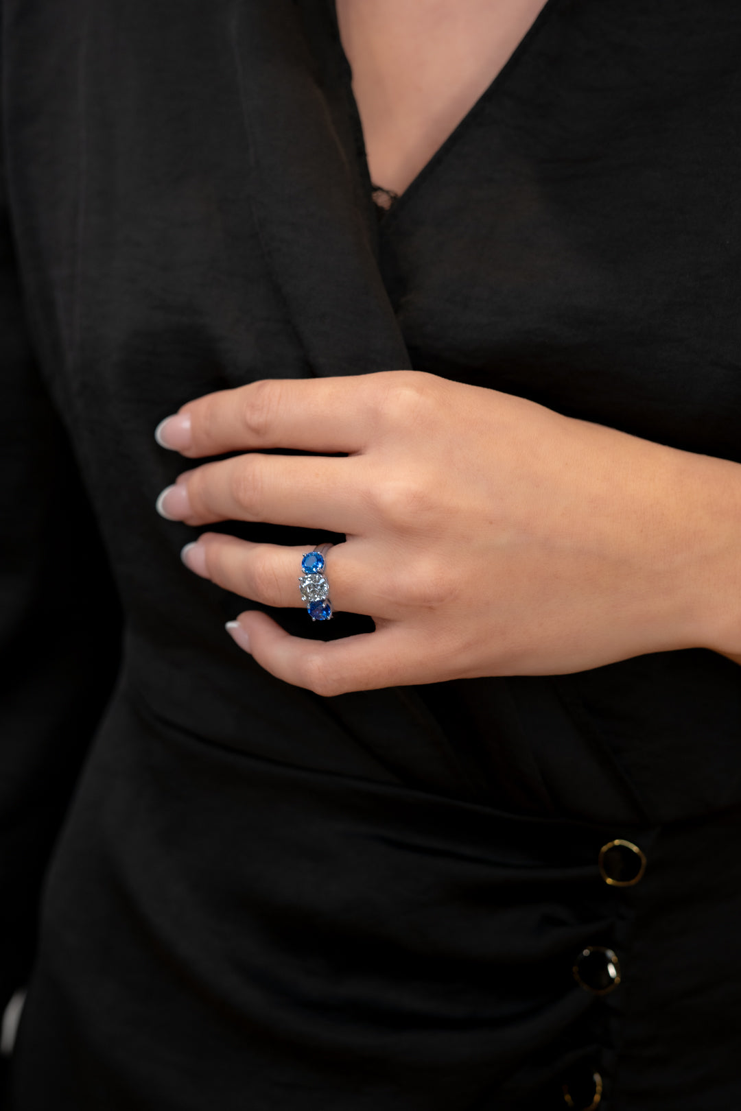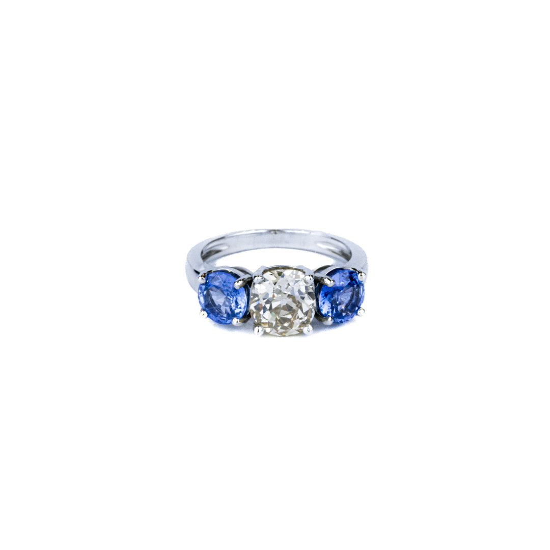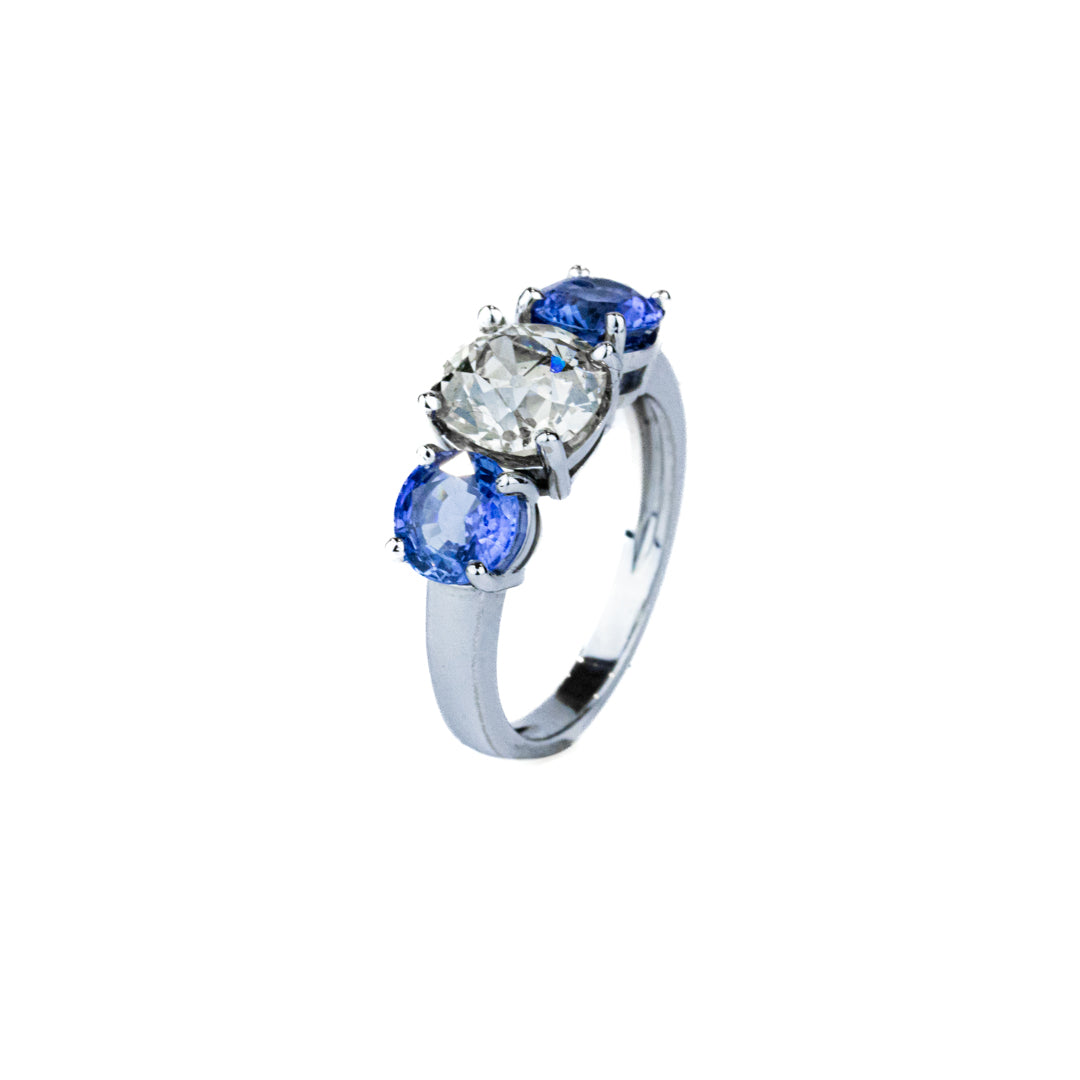 Bague de la Collection Cinq C, création unique, or blanc 18 carats 750/1000, sertie au centre d'un diamant taille ancienne de 1,85 carats accompagné de 2 Saphir Ceylan pour 2,13 carats.