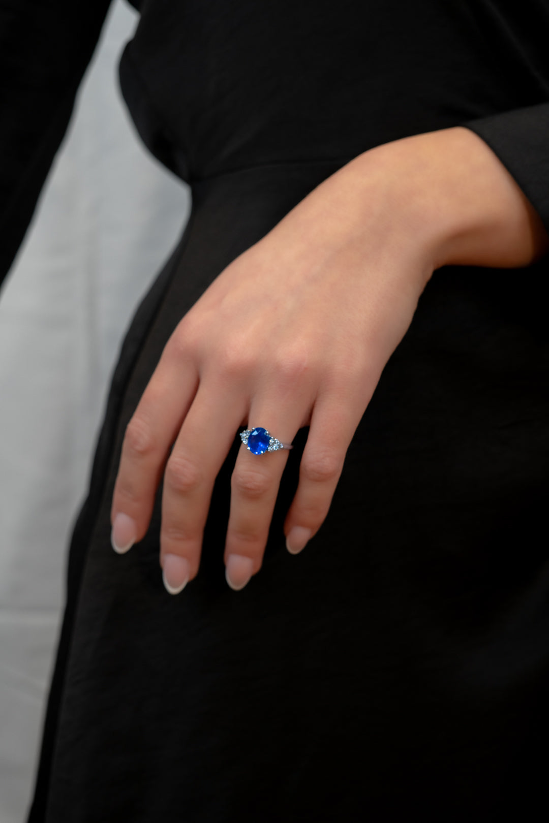 Bague de la Collection Cinq C, création unique, or blanc 18 carats 750/1000, sertie d'un Saphir naturel Ceylan de 2,93 carats et de 6 diamants pour 0,55 carats.