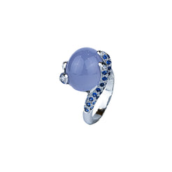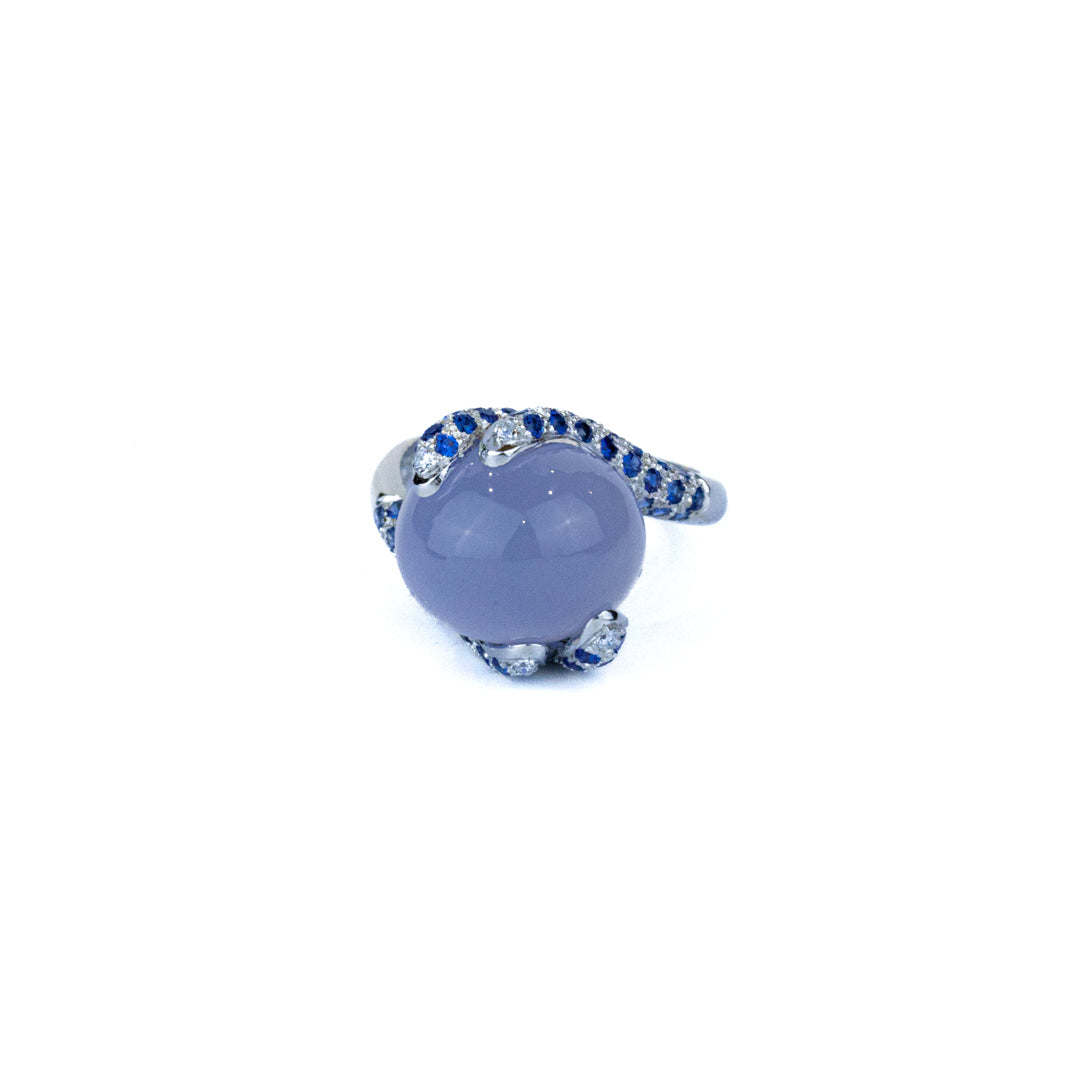 Bague de la collection Cinq C, création unique, or blanc 18 carats 750/1000, sertie d'une Calcédoine Cabochon de 7,2 carats, ainsi que 66 Saphirs bleus pour 1,2 carats et de 4 Diamants pour 0,05 carats.