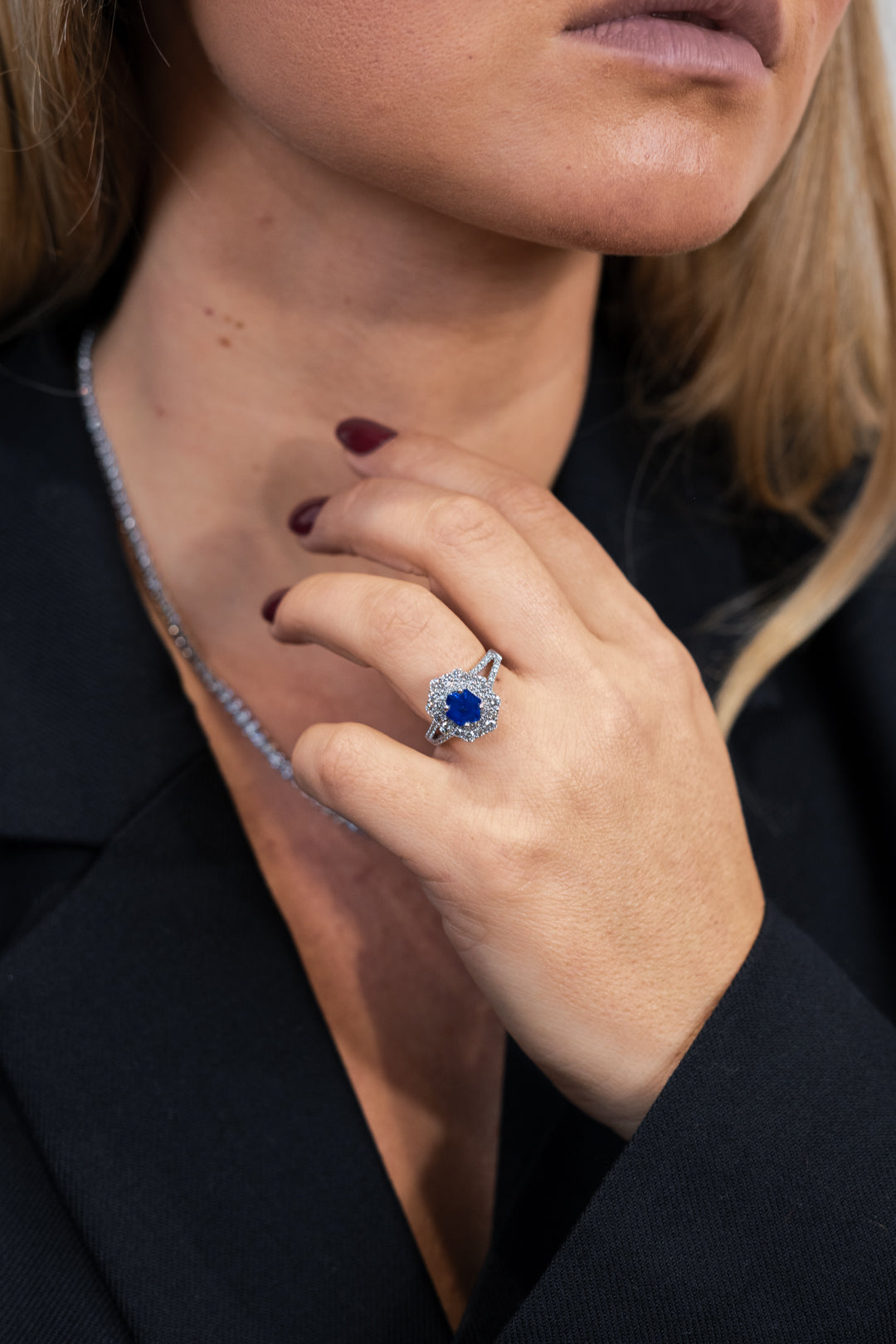 Bague de la Collection Cinq C, création unique, or blanc 18 carats (750/1000), sertie d'un Saphir Ceylan naturel de 3,15 carats et de 66 diamants pour 1,40 carats.